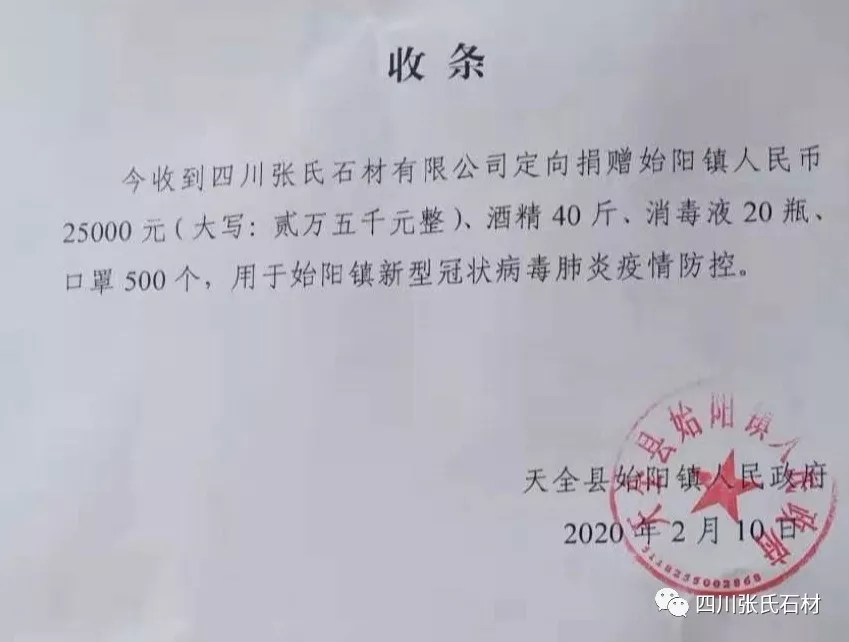2月9日,張氏石材公司領導爲“抗擊新型冠狀病毒感染的肺炎疫情”發起募捐行動,倡導張氏石材家人攜手開展愛(ài)心捐贈,呼籲大家,攜起手來,積極捐贈疫情防控急需的物品,並(bìng)獲得大家的積極響應。截止2月9日晚9點,張氏家人們已自發捐款一萬元。公司捐款共計4萬元整,並(bìng)捐贈疫情所需物品:酒精共計(jì)80斤,消毒液40瓶,口罩1000個。分發(fā)至蘆山縣飛(fēi)仙關鎮、天全縣始陽鎮政府,其中蘆山縣飛(fēi)仙關鎮具體捐贈物資:酒精40斤,消毒液20瓶,口罩500個,現金25000元。天全縣始陽鎮:酒精40斤,消毒液20瓶,口罩500個,現金25000元。萬衆一心,衆志成城,共同抗擊(jī)疫情,以實際行動(dòng)支持疫情防控工作。